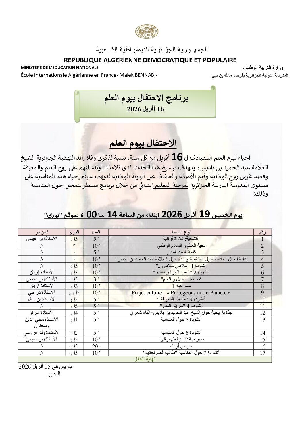 Cette célébration vise à ancrer dans l’esprit de nos élèves l’importance de la science et de la connaissance, tout en renforçant les valeurs de patriotisme, d’authenticité et de préservation de l’identité nationale. Elle constitue également une occasion privilégiée pour rappeler le rôle essentiel de l’éducation dans la construction des générations futures.