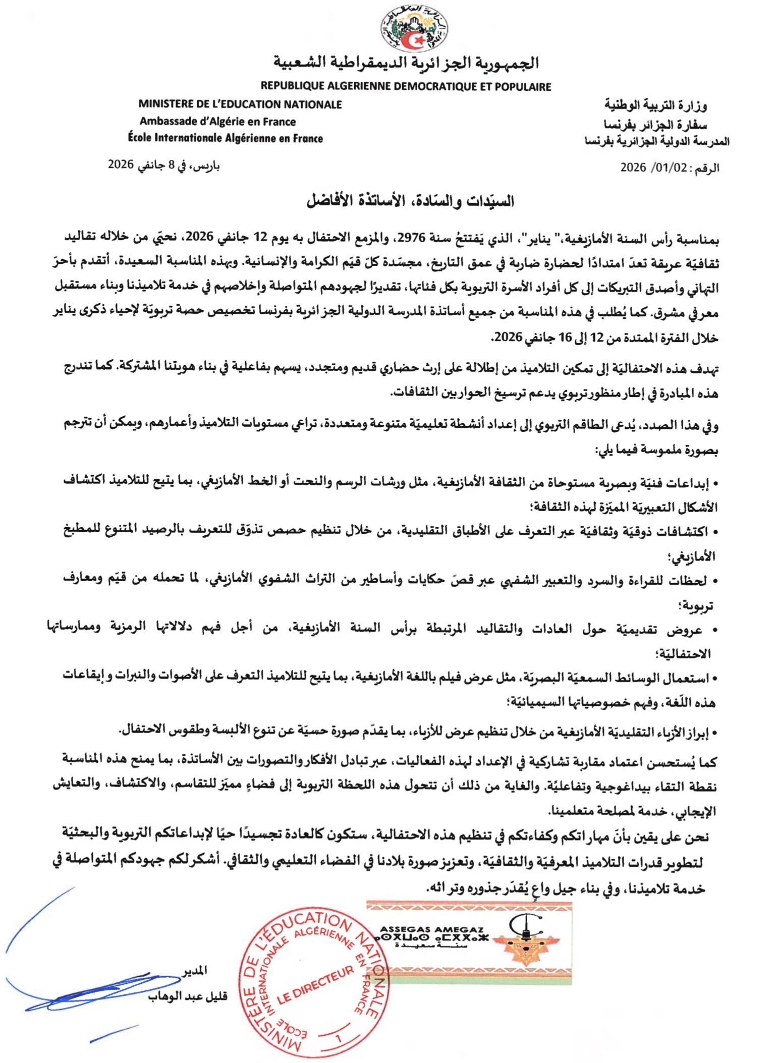Dans cette dynamique, il est demandé à l’ensemble des enseignants de consacrer une séance pédagogique à la commémoration de Yennayer durant la période allant du 12 au 16 janvier 2026. L’objectif est clair : offrir aux élèves un regard ouvert, éclairé et vivant sur un patrimoine culturel ancien, toujours actuel, porteur de savoirs, de valeurs et de coutumes qui enrichissent le dialogue interculturel et nourrissent la transmission des héritages.